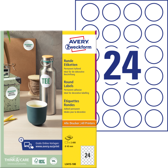 Создавайте индивидуальные этикетки, используя бесплатные шаблоны и программное обеспечение Avery Zweckform, доступные онлайн, или воспользуйтесь встроенными шаблонами Microsoft® Office. Просто разработайте свой дизайн, загрузите лист формата A4 в принтер и распечатайте для получения профессиональных результатов.